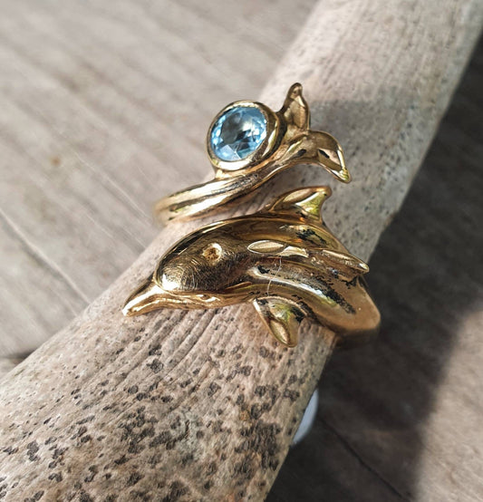 gold dolphin ring,9k gold, blue topaz,beautiful detail,porpous surf wrap around adjustable ring