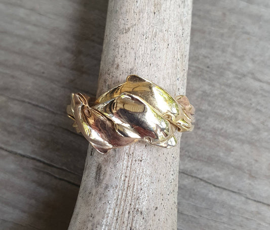 gold dolphin puzzel ring,9ct gold mixed metals,not plated,white gold,rose and yellow gold,boho,gypsy,new age,