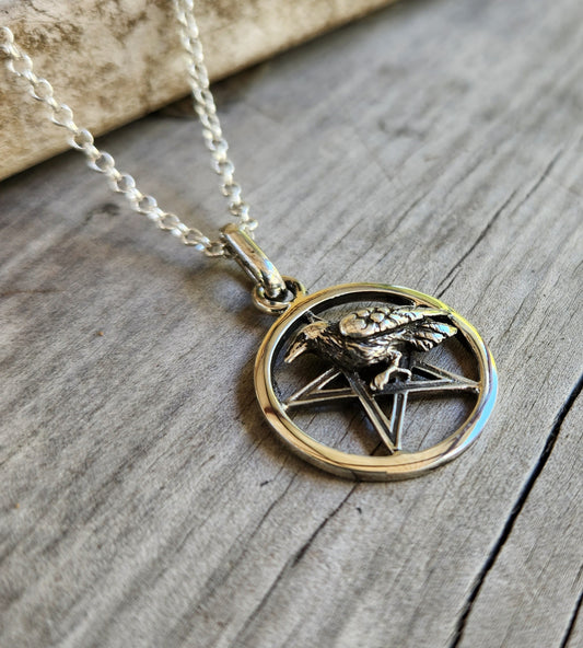 Raven Pentagram pendant,sterling silver,crow, bird,occult wiccan,witch ,magic,druid,goth