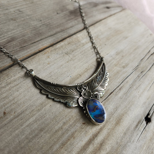 Large opal necklace.solid sterling silver, woodland leaves and flowers,Navajo Indian style necklace pendant