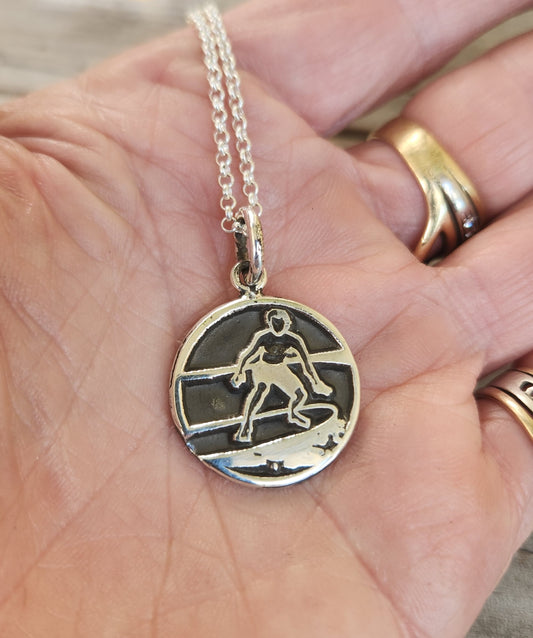 Surfer pendant,925 sterling silver disc, surf board rider,