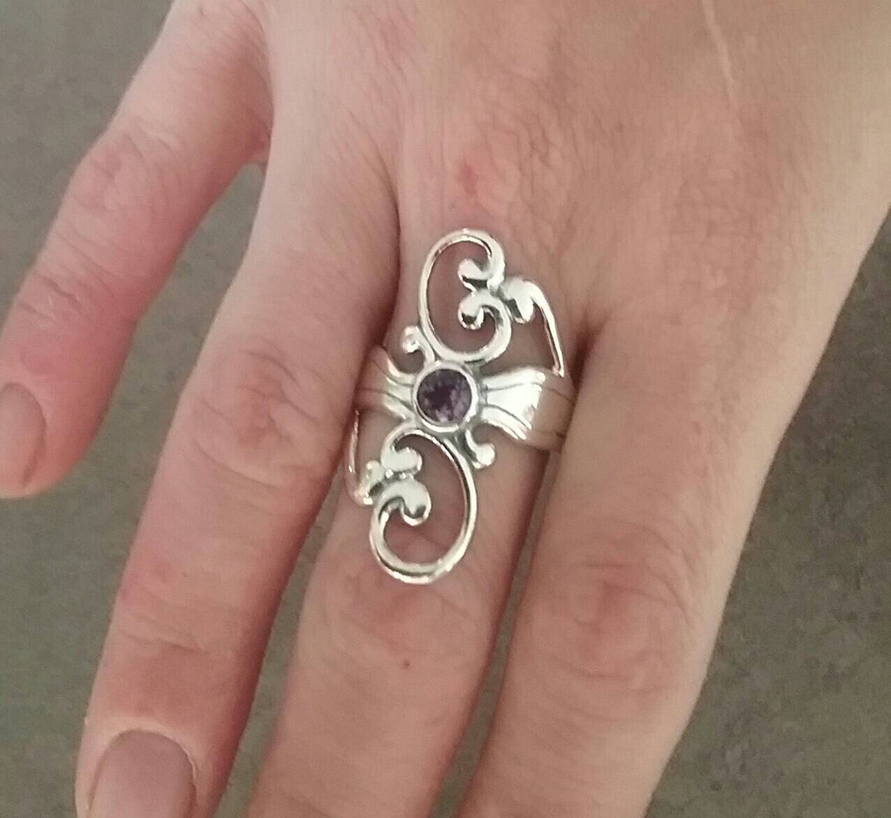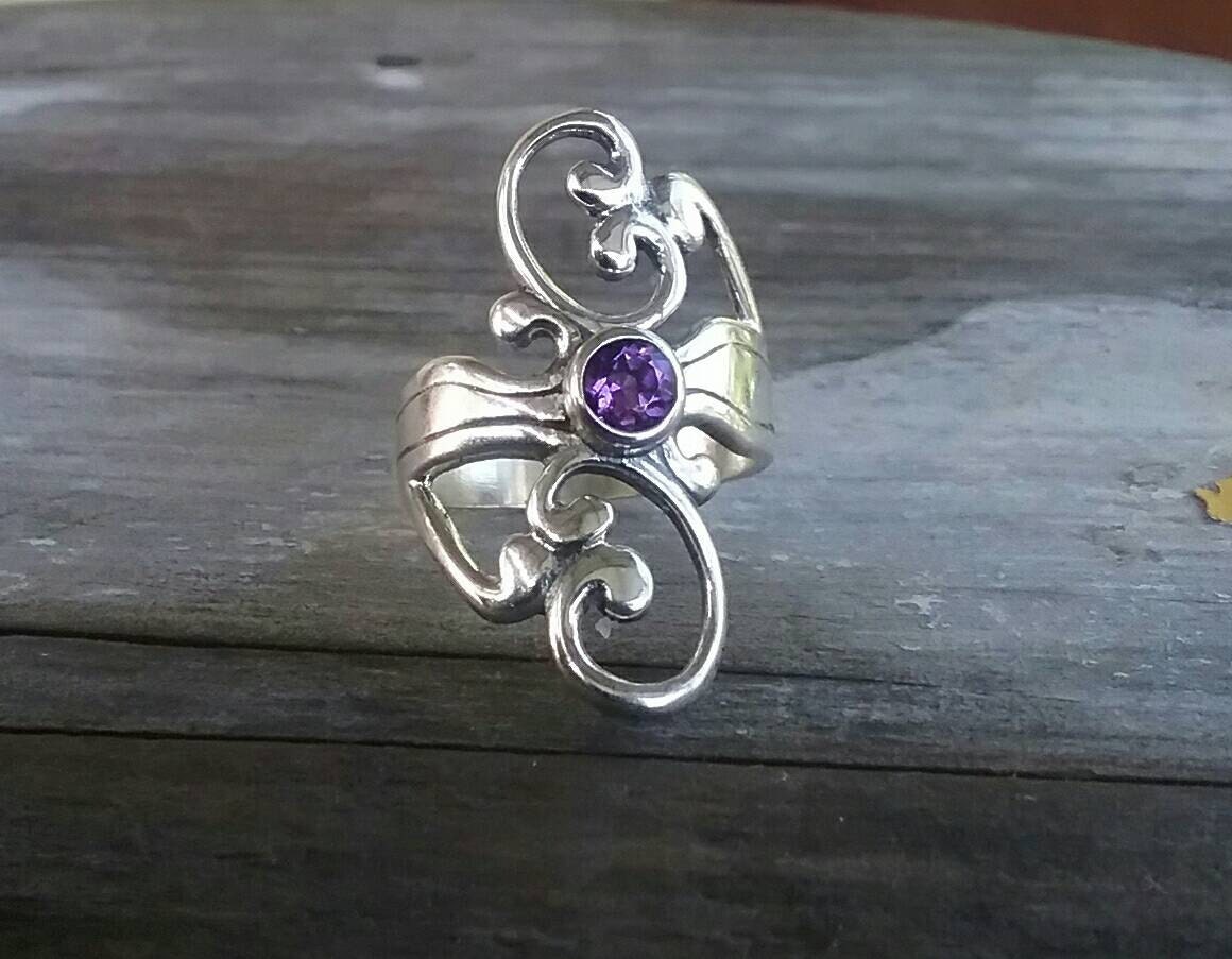 long plain silver swirl ring ,925 sterling silver,purple cubic zirconia,gothic,art nouveau, handmade,vintage,scrolls,boho,gypsy goddess
